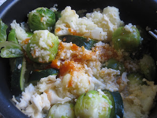 i'm starting to cook real meals. this, friends, is couscous, brussel spouts, cauliflower, an egg (needed the protein some how), a chicken boullion cube, hot sauce, and hummus. kinda, sorta tasty.